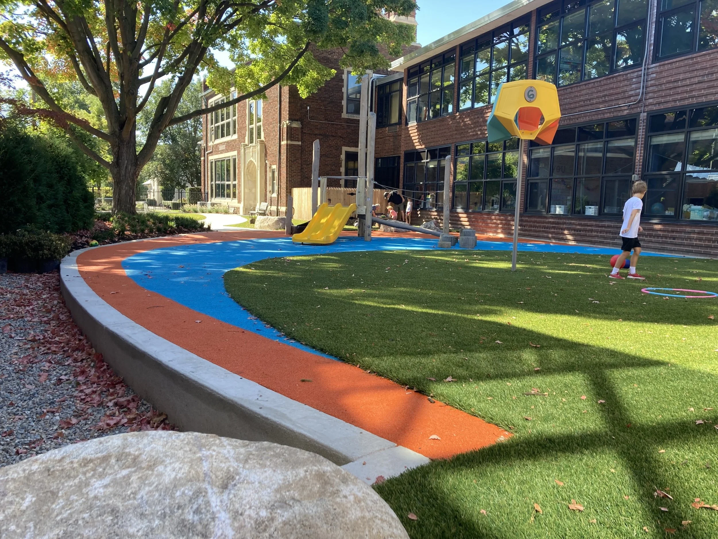 The outdoor courtyard serves as the primary play area for K-3 students. Bold colors and geometric shapes were integrated into the space to draw students in immediately. The design offers intimate spaces for imaginative play and open areas for group games and events. Unique features encourage creativity and self-expression, while versatile play structures invite children to create their own games and challenges. Low-maintenance play surfaces, including turf lawns and poured-in-place rubber, enhance durability, while new pathways allow easy circulation. A walking loop doubles as a racetrack and offers space for games like hopscotch and four-square. Boulders and log stumps serve as seating and challenge course elements, adding adventure to the space. Outdoor teaching areas enable customizable learning environments, while a butterfly garden demonstrates environmental processes in real time. The renovated courtyard will inspire countless children, nurturing their physical, creative, and social development for years to come.